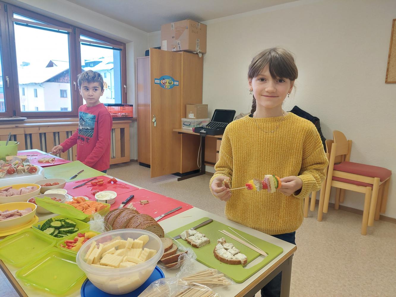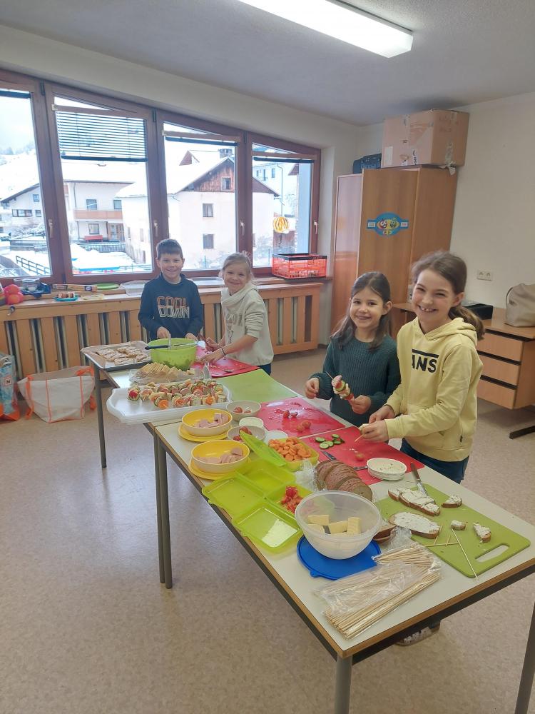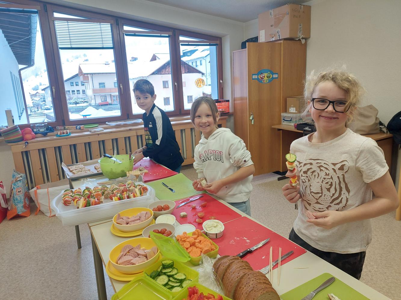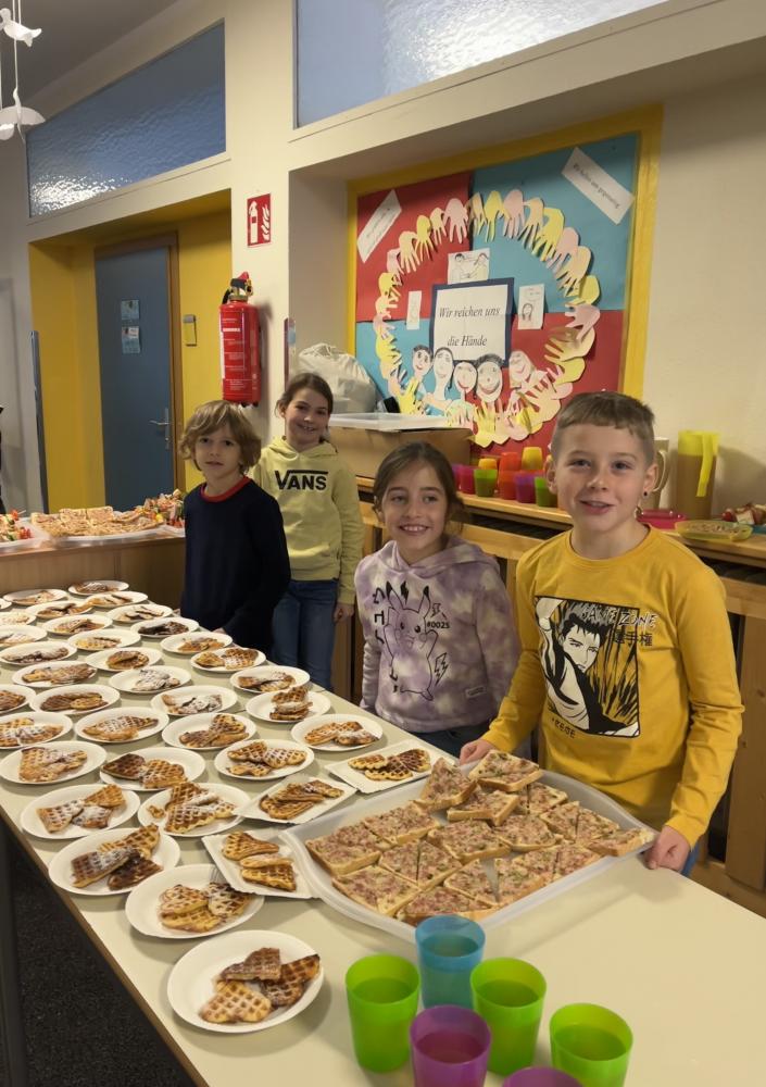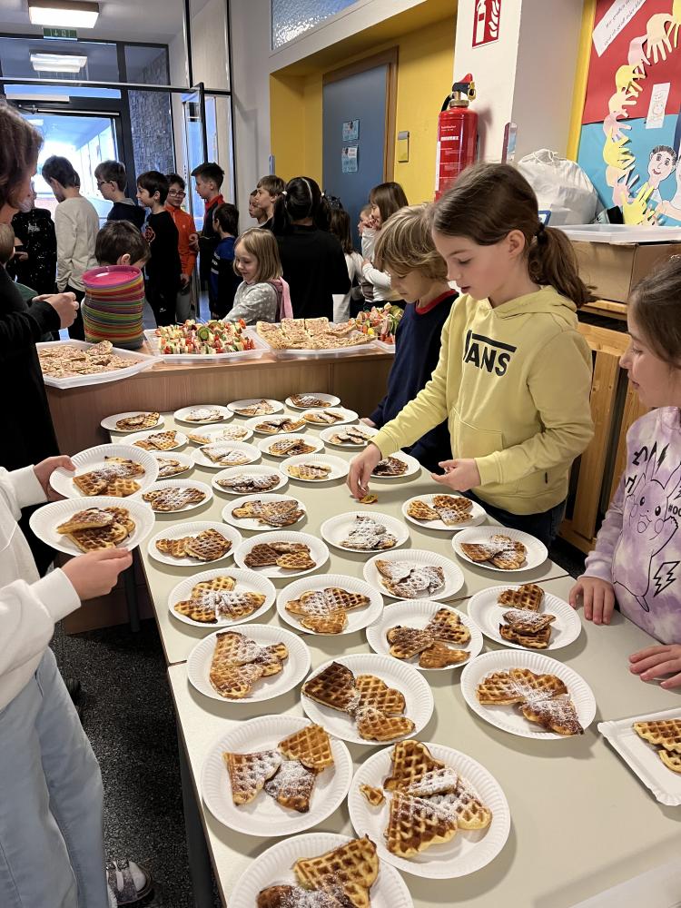 Ein Mal im Monat bereitet eine Klasse die Gesunde Jause für die ganze Schule zu. Am Donnerstag, den 14.12.23, war die 3. Klasse an der Reihe. Mit Unterstützung der Eltern wurden neben Getränken wie Weihnachtspunsch und Apfelsaft noch Brotspieße, Pizzatoasts und Waffeln vorbereitet. Nachdem das Buffet angerichtet wurde, konnte es mit dem Verkauf der Speisen und Getränken losgehen.