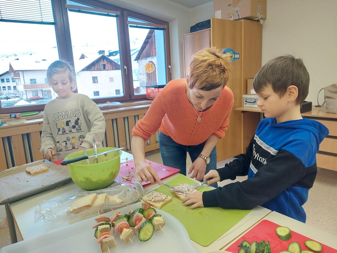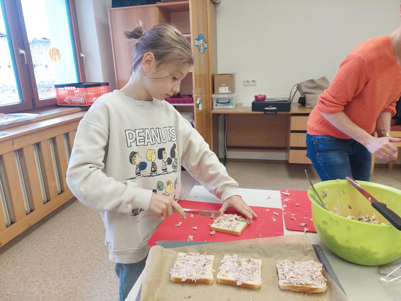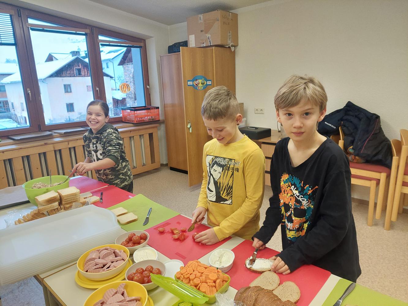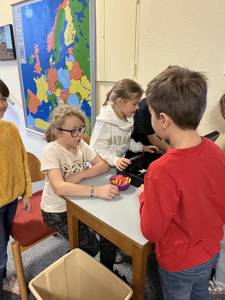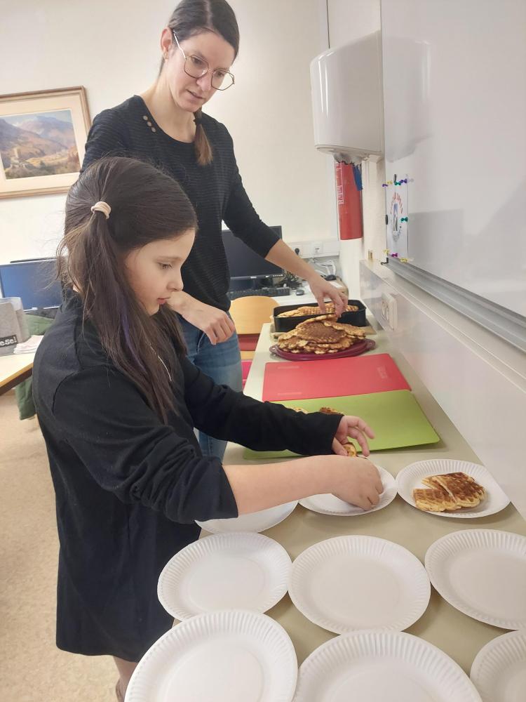 Ein Mal im Monat bereitet eine Klasse die Gesunde Jause für die ganze Schule zu. Am Donnerstag, den 14.12.23, war die 3. Klasse an der Reihe. Mit Unterstützung der Eltern wurden neben Getränken wie Weihnachtspunsch und Apfelsaft noch Brotspieße, Pizzatoasts und Waffeln vorbereitet. Nachdem das Buffet angerichtet wurde, konnte es mit dem Verkauf der Speisen und Getränken losgehen.