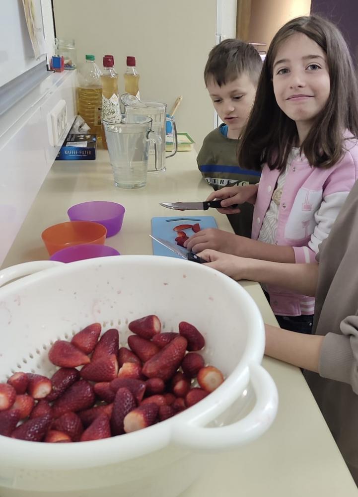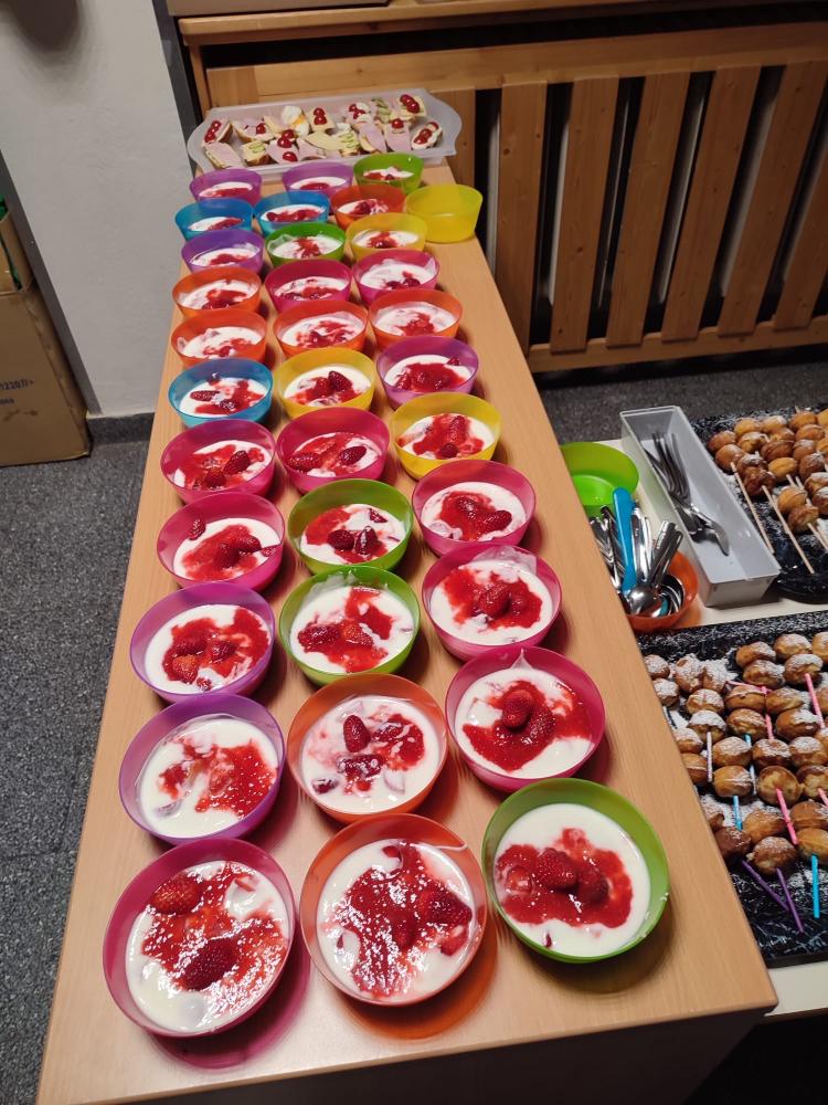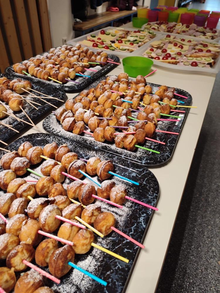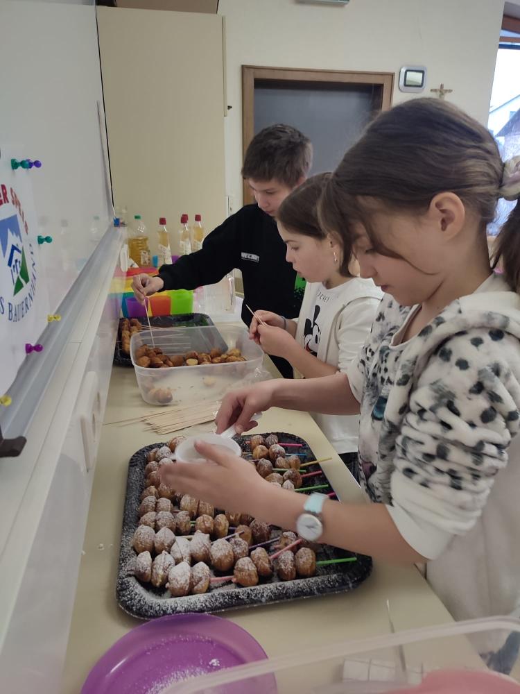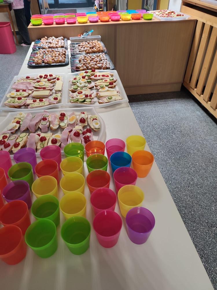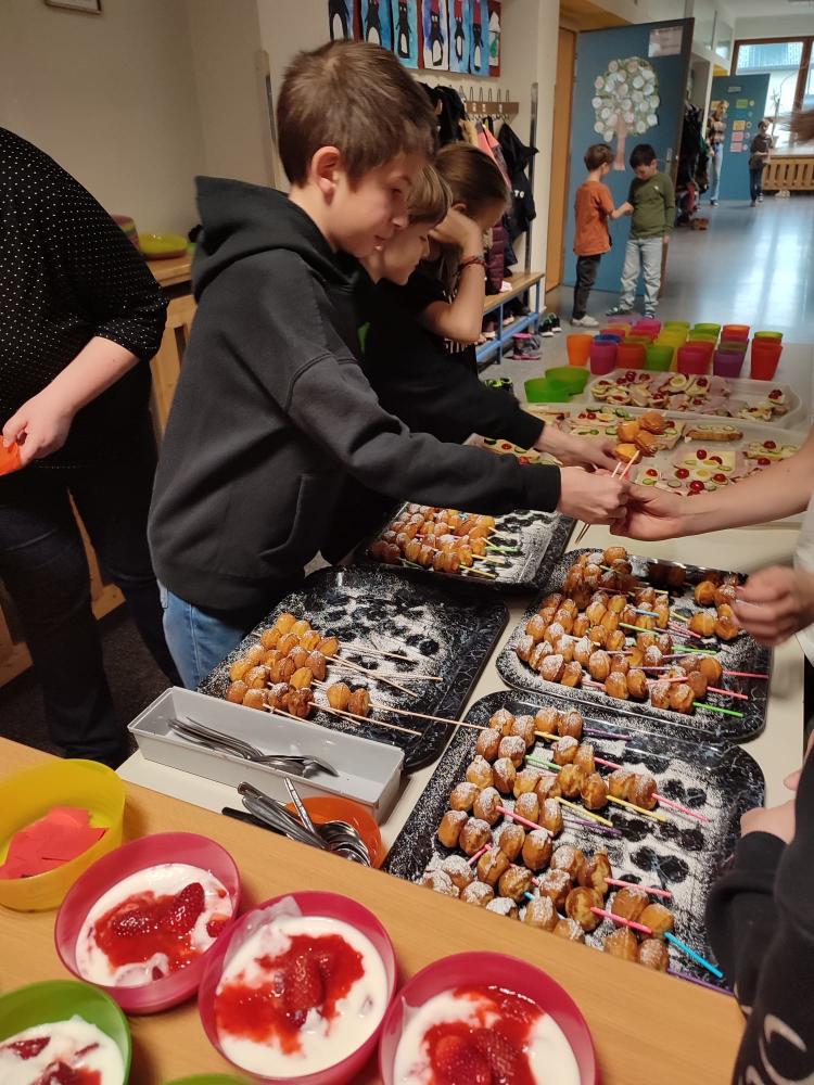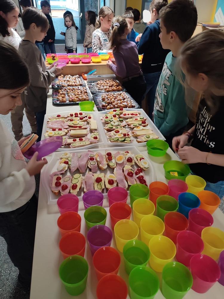 Am Mittwoch, den 10.04.24, war es endlich wieder soweit und die Gesunde Jause fand statt. Dieses Mal war wieder die 3. Klasse an der Reihe und richtete ein tolles Buffet an. Mit Unterstützung der Eltern wurden neben Holundersaft noch belegte Laugenbrötchen, Apfel-Cake-Pops und Joghurt mit frischen Erdbeeren vorbereitet. Nachdem das Buffet fertig angerichtet wurde, konnte es mit dem Verkauf der Speisen und Getränken losgehen.