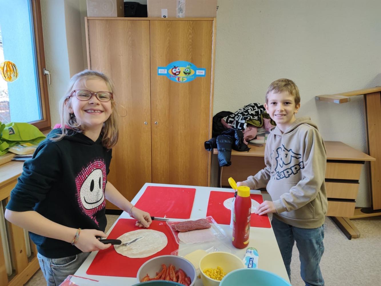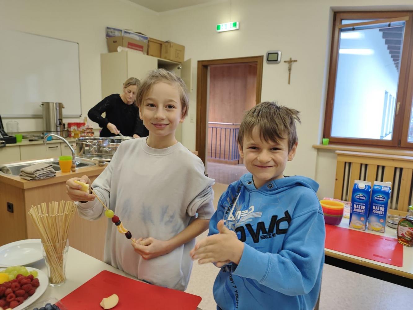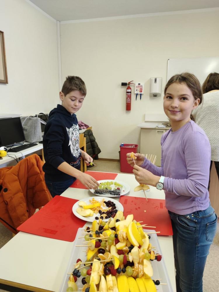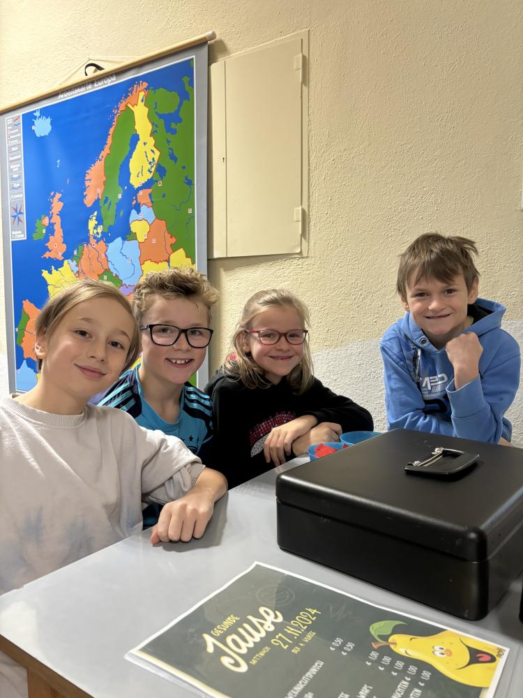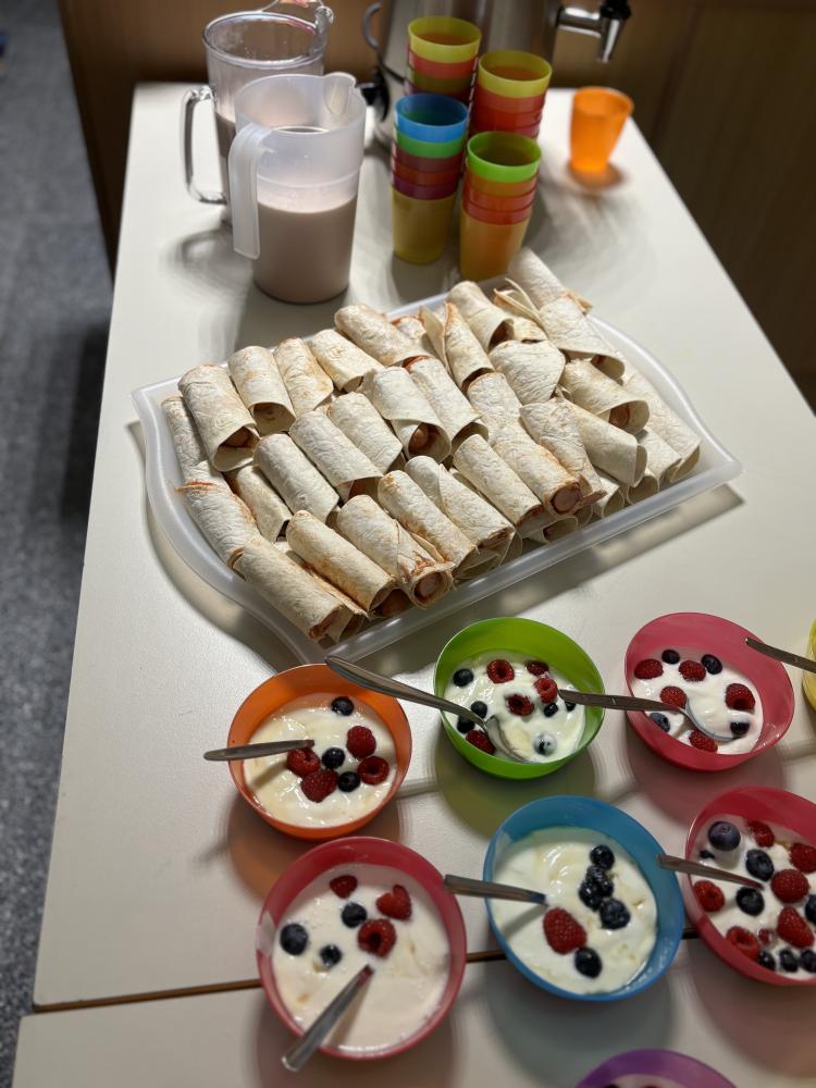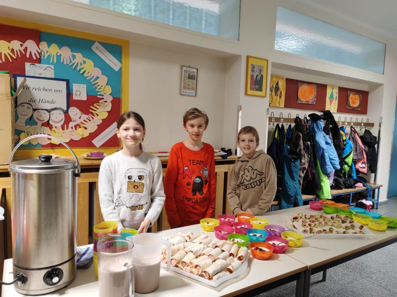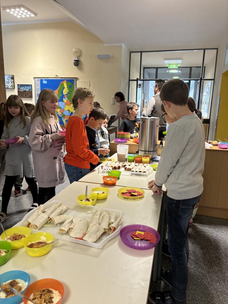 Am Mittwoch, den 27.11.24, war es wieder so weit und die Gesunde Jause fand das erste Mal im Schuljahr 2024/25 statt. Die 4. Klasse richtete ein tolles Buffet an. Mit Unterstützung der Eltern wurden neben Getränken wie Weihnachtspunsch und Kakao noch Obstspieße, Wraps (Gemüse-Wraps und Hotdog-Wraps), Milchreis mit Bratäpfeln und Joghurt mit frischen Früchten vorbereitet. Nachdem das Buffet fertig angerichtet war, konnte es mit dem Verkauf der Speisen und den Getränken losgehen.