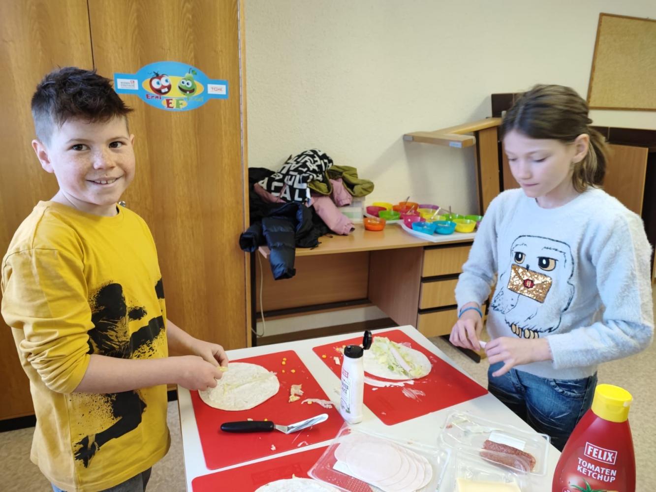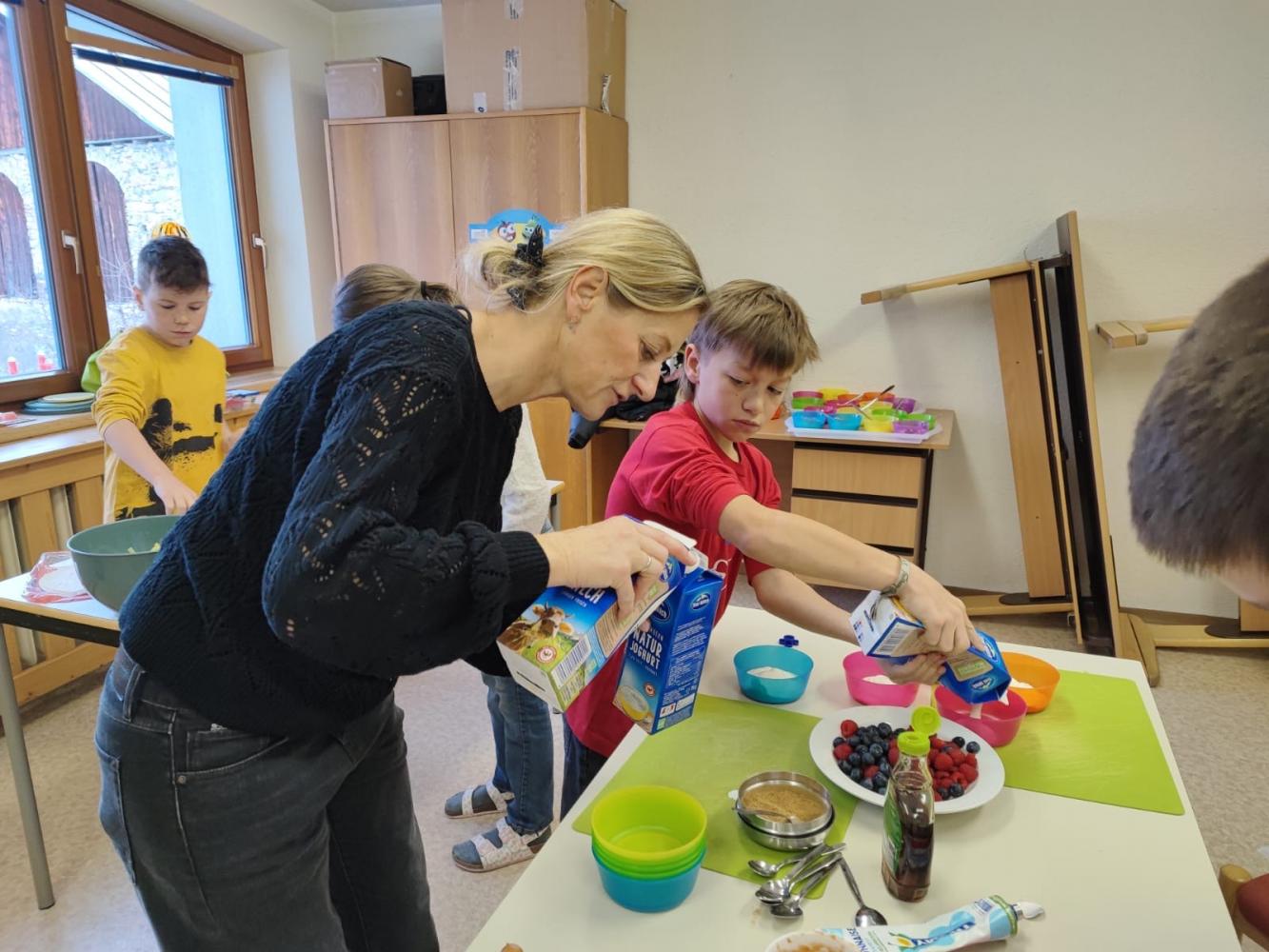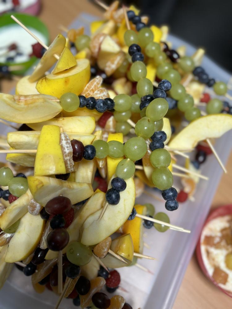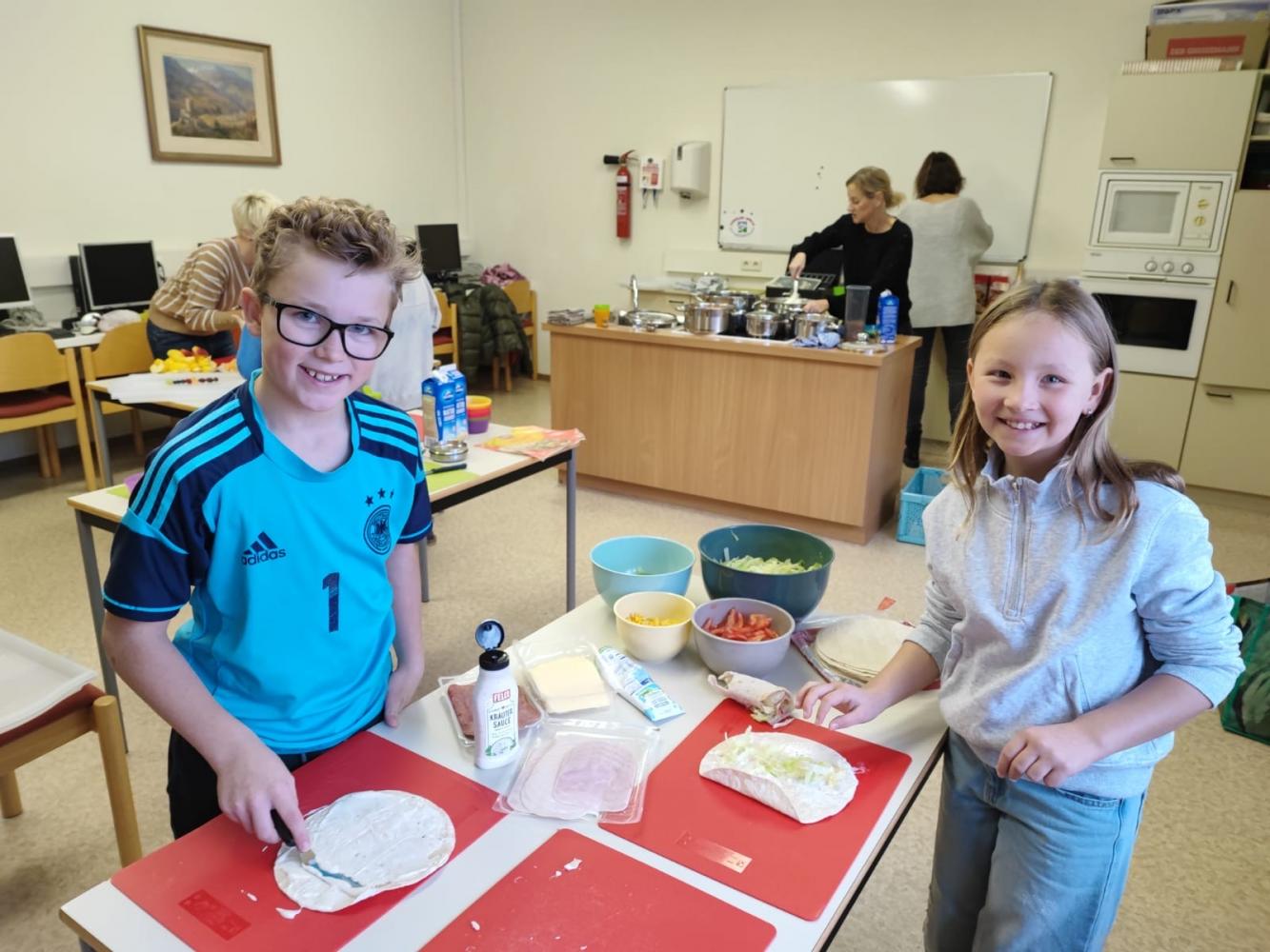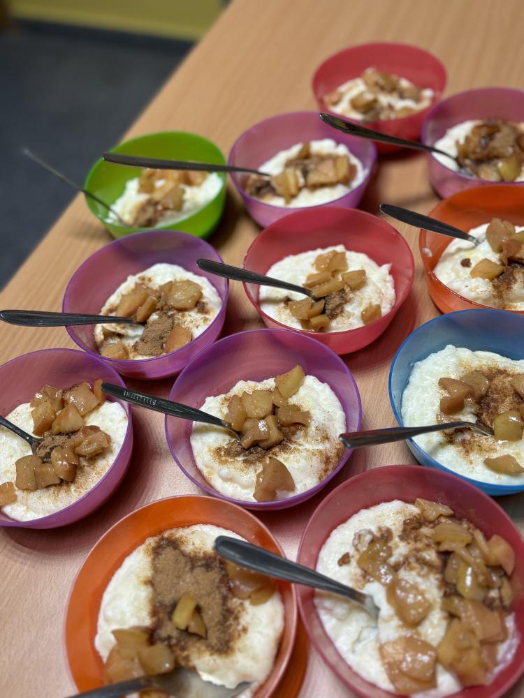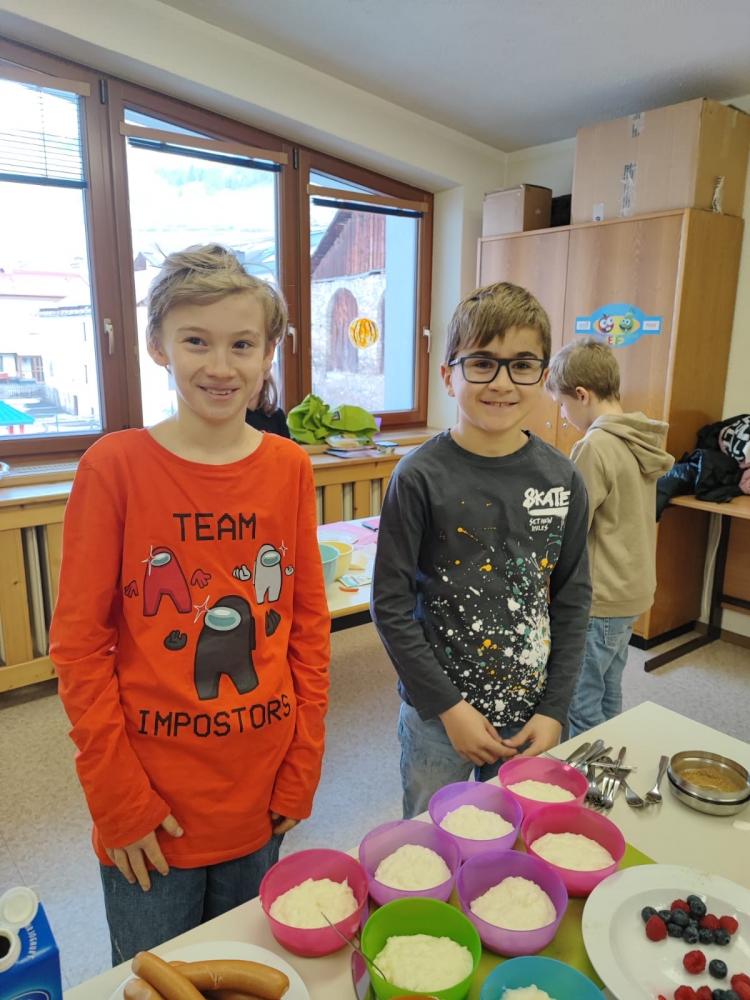 Am Mittwoch, den 27.11.24, war es wieder so weit und die Gesunde Jause fand das erste Mal im Schuljahr 2024/25 statt. Die 4. Klasse richtete ein tolles Buffet an. Mit Unterstützung der Eltern wurden neben Getränken wie Weihnachtspunsch und Kakao noch Obstspieße, Wraps (Gemüse-Wraps und Hotdog-Wraps), Milchreis mit Bratäpfeln und Joghurt mit frischen Früchten vorbereitet. Nachdem das Buffet fertig angerichtet war, konnte es mit dem Verkauf der Speisen und den Getränken losgehen.