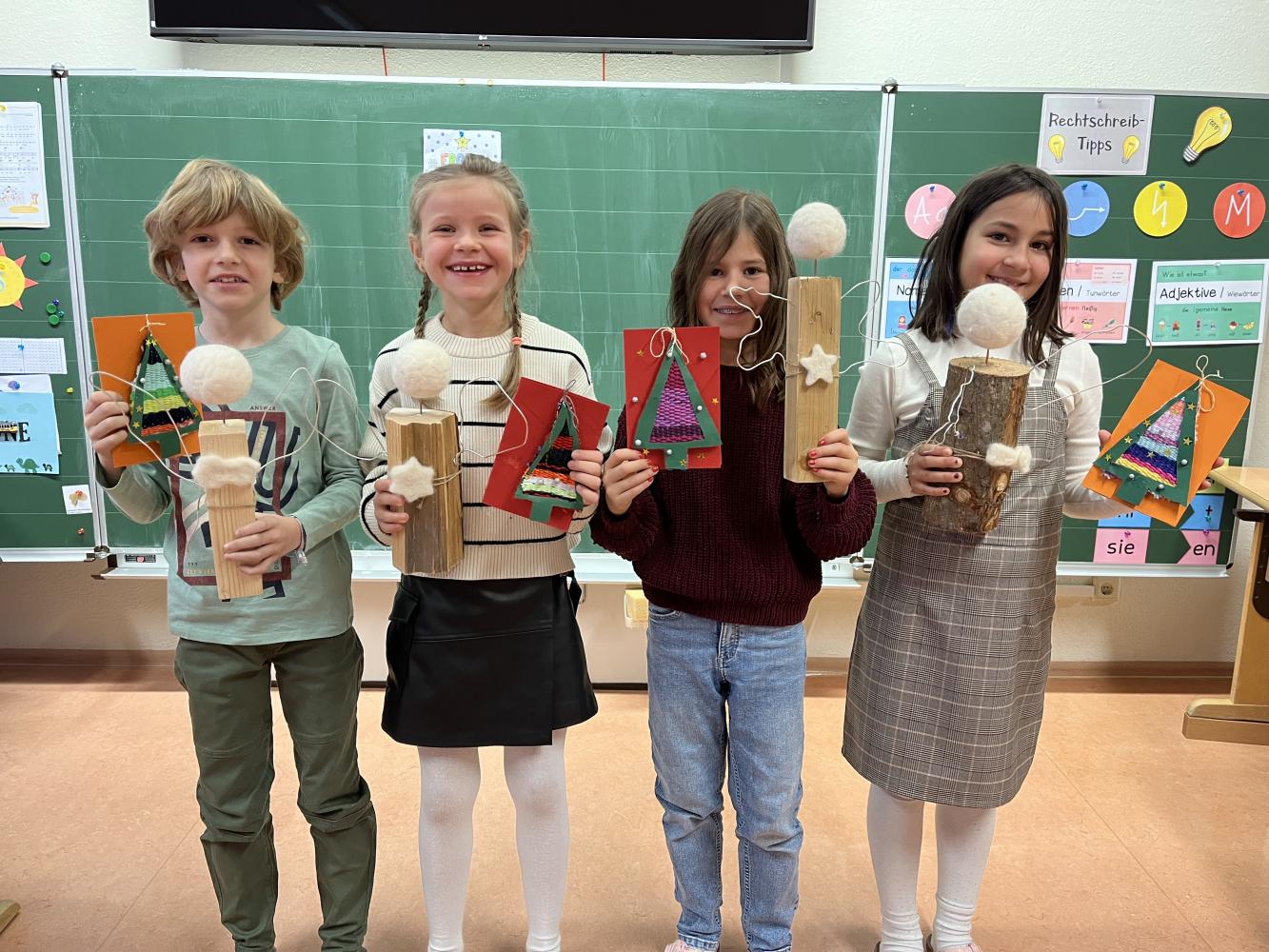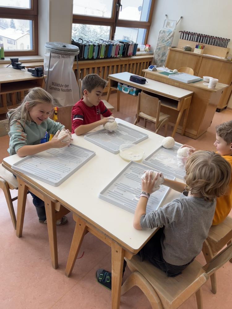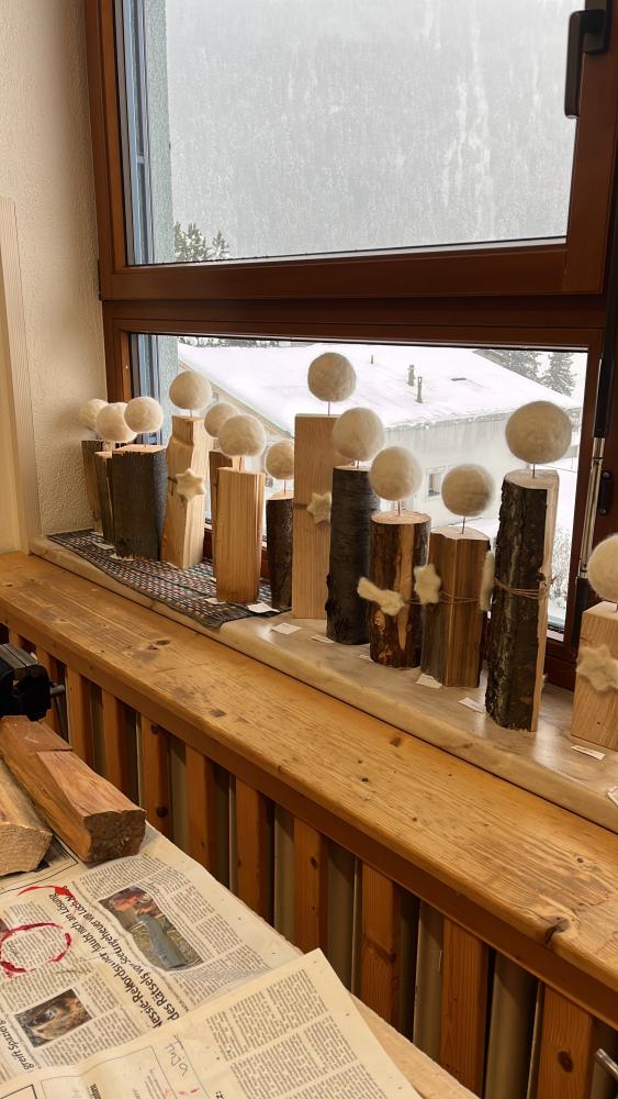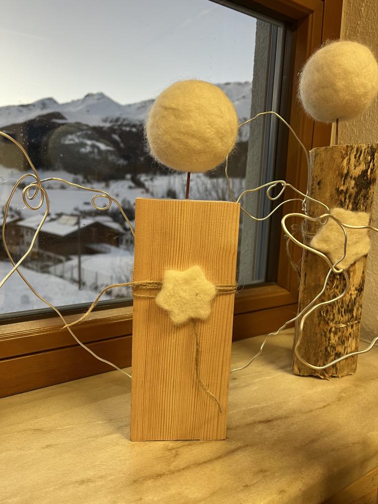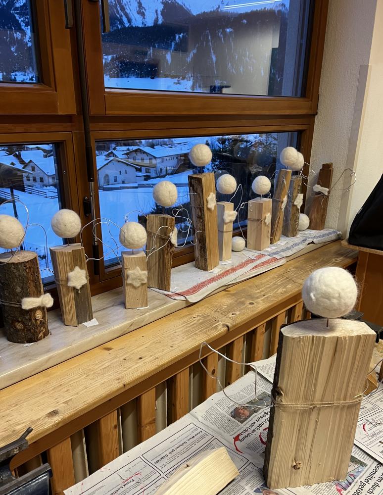 In der Adventszeit wagte sich die 3. Klasse an das Nassfilzen heran. Mit Schmierseife, warmen Wasser, Wolle von regionalen Tiroler Bergschafen (Schafwollfabrik Ried-Frauns) und viel Geduld wurden Köpfe gefilzt. Am Ende wurden alle Einzelteile wie Holzscheit, Filzkugel und aus Draht geformte Flügel zu individuellen Einzelstücken zusammengefügt. Die Freude über das gute Gelingen der Holzscheit-Engel ist in den Gesichtern der Kinder ablesbar.