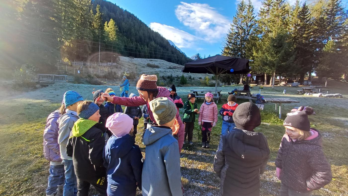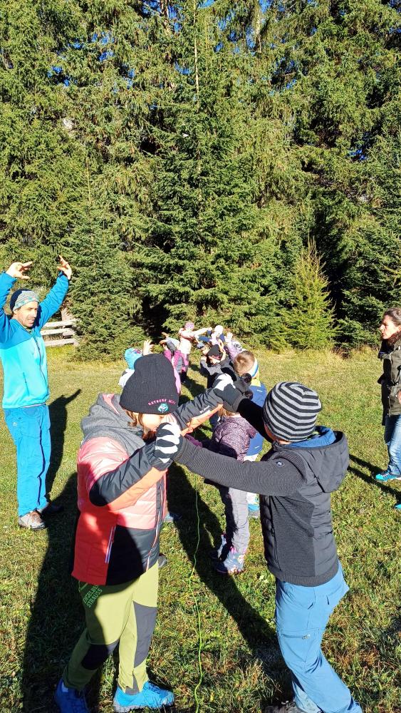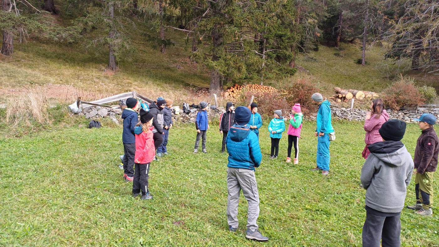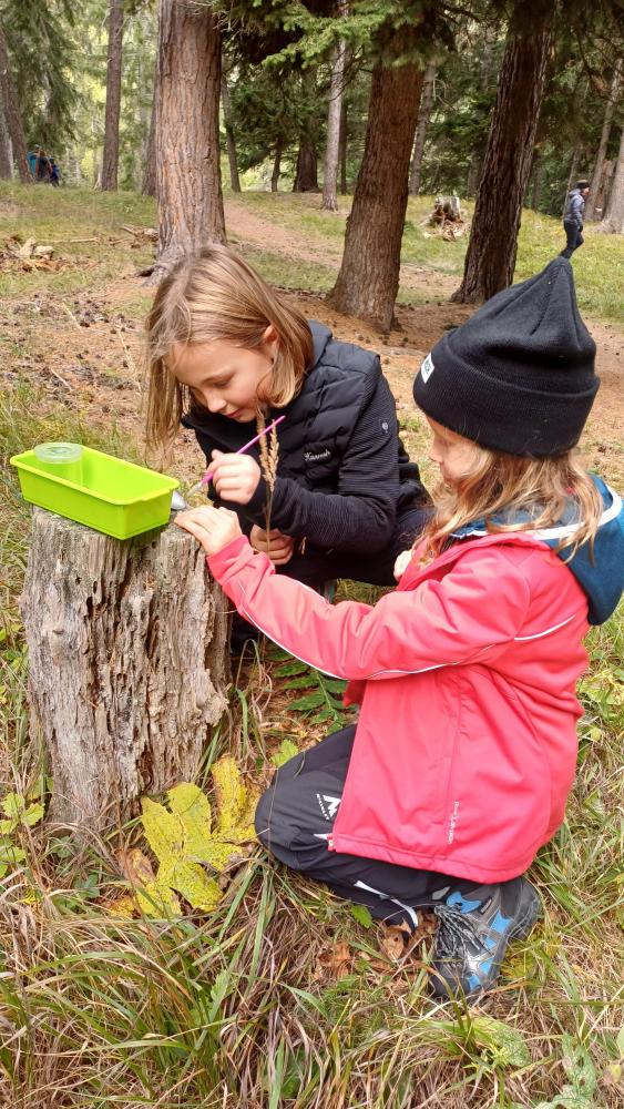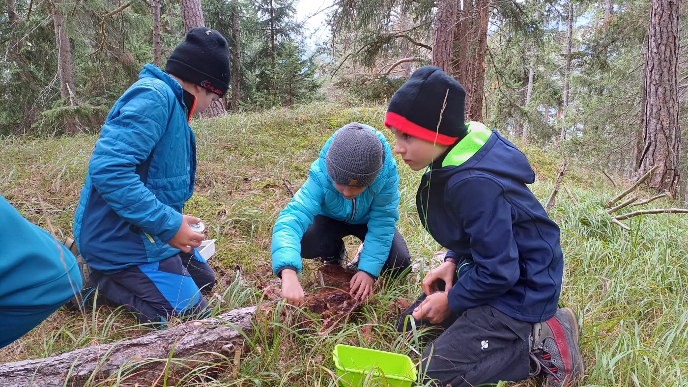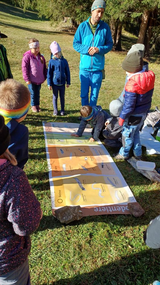 Die 1. Klasse wanderte von der Schule Richtung Mösle. Nach einer kurzen Vorstellungsrunde bekamen die Kinder den Auftrag, Herbstboten zu suchen. Im Anschluss wurden die SchülerInnen in Blätter verwandelt und sausten über die Wiese. Gott sei Dank wurden sie dann doch wieder zurückverwandelt und durften mithilfe von Löffeln, (Becher-)Lupen und kleinen Behältern den Waldboden als ForscherInnen erkunden. Viele kleine, aber auch etwas größere Waldbewohner wurden entdeckt, untersucht und vorgestellt. Abschließend konnten die Kinder sich als Hirsche im Hirschkampf noch richtig auspowern, bevor der informative und lustige Vormittag endete.