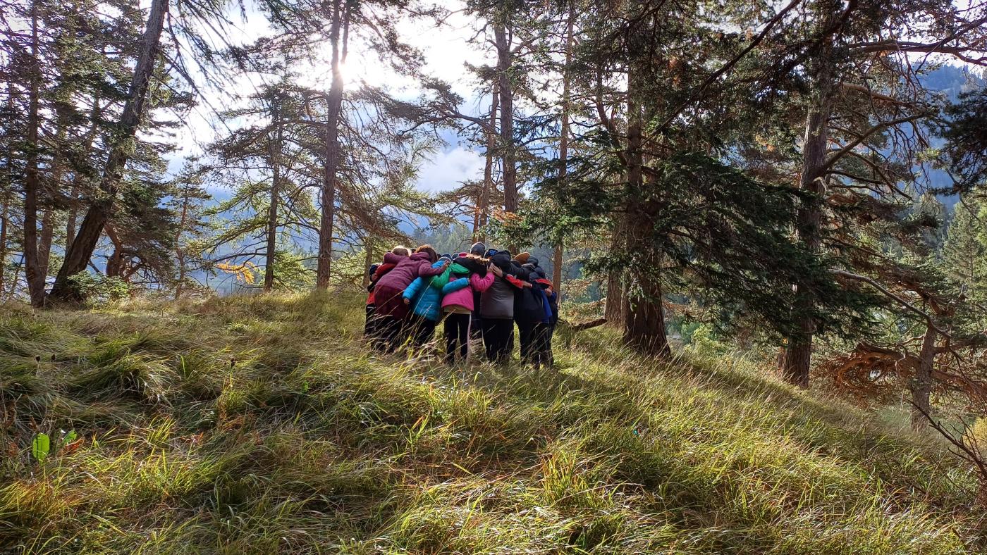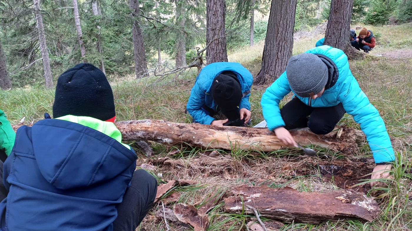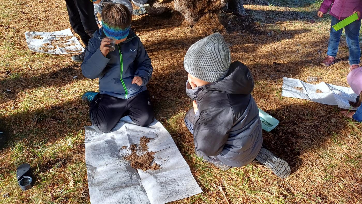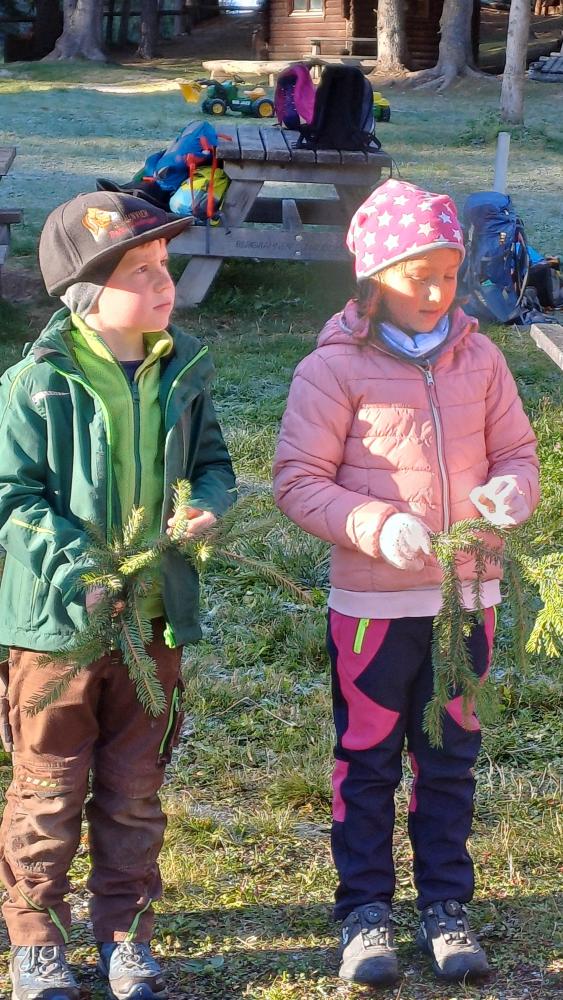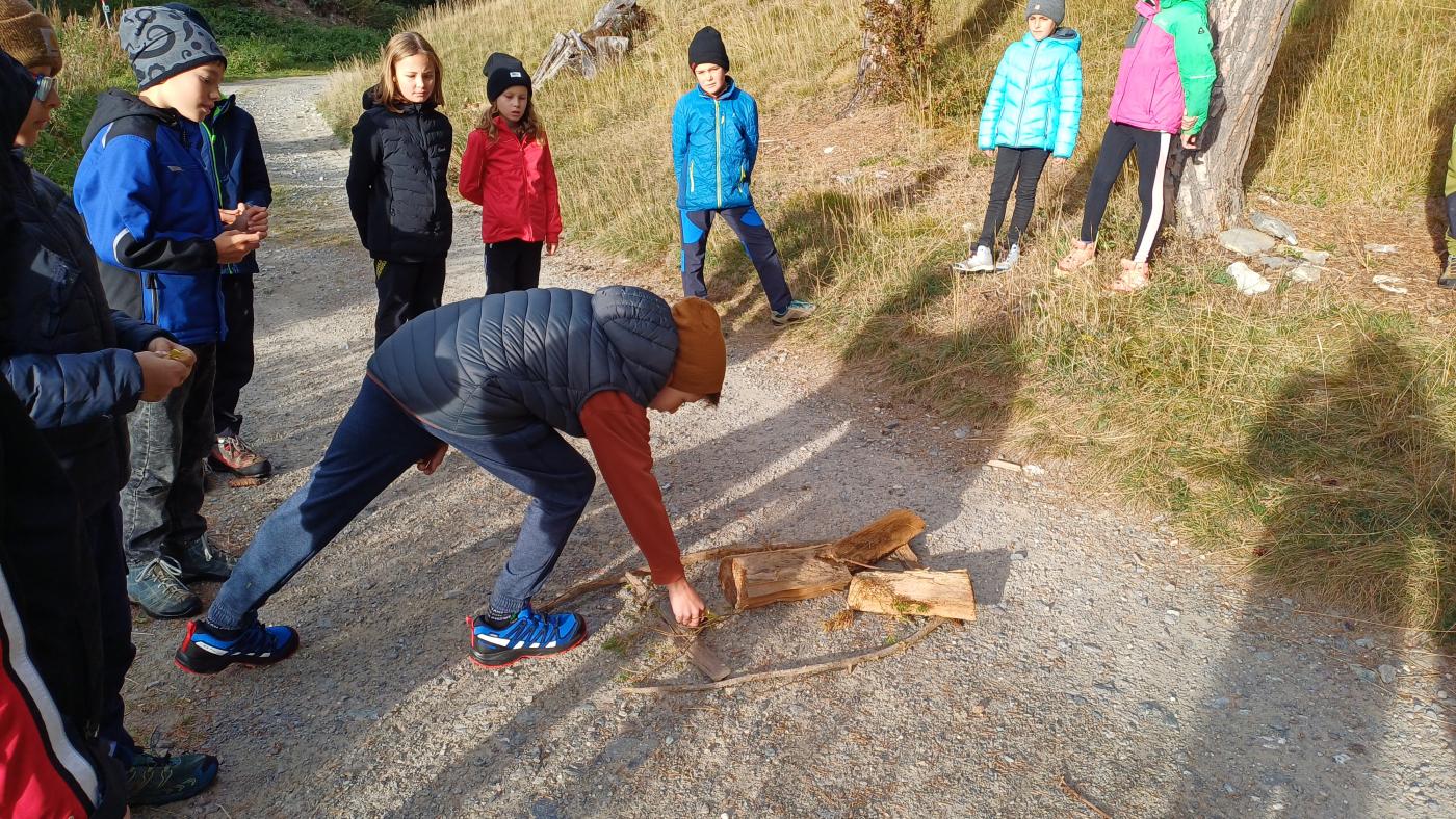Die 1. Klasse wanderte von der Schule Richtung Mösle. Nach einer kurzen Vorstellungsrunde bekamen die Kinder den Auftrag, Herbstboten zu suchen. Im Anschluss wurden die SchülerInnen in Blätter verwandelt und sausten über die Wiese. Gott sei Dank wurden sie dann doch wieder zurückverwandelt und durften mithilfe von Löffeln, (Becher-)Lupen und kleinen Behältern den Waldboden als ForscherInnen erkunden. Viele kleine, aber auch etwas größere Waldbewohner wurden entdeckt, untersucht und vorgestellt. Abschließend konnten die Kinder sich als Hirsche im Hirschkampf noch richtig auspowern, bevor der informative und lustige Vormittag endete.