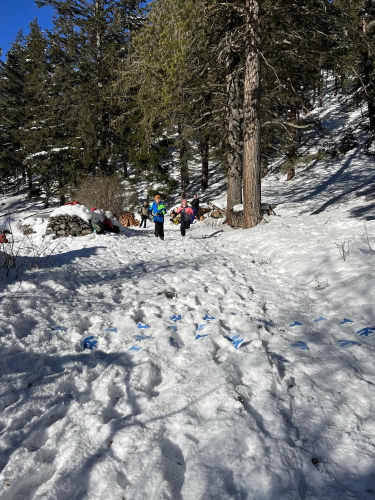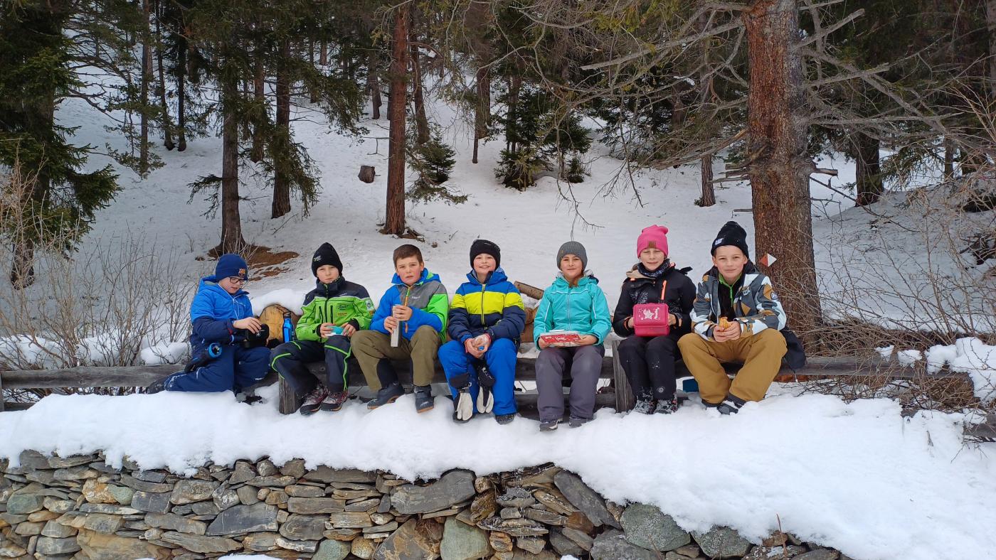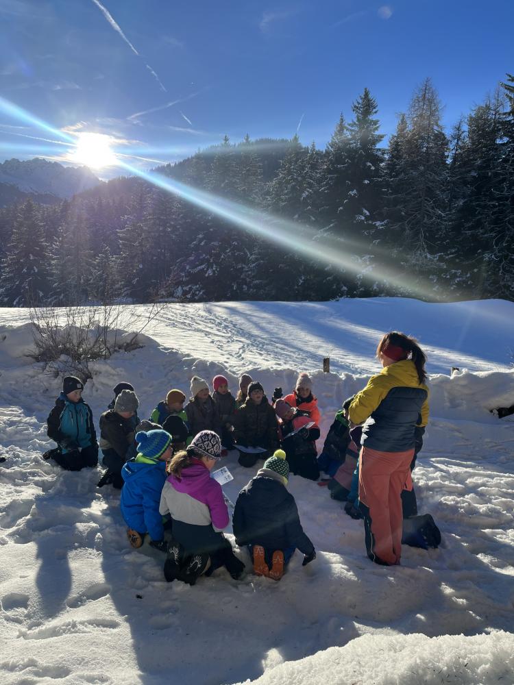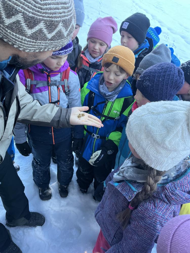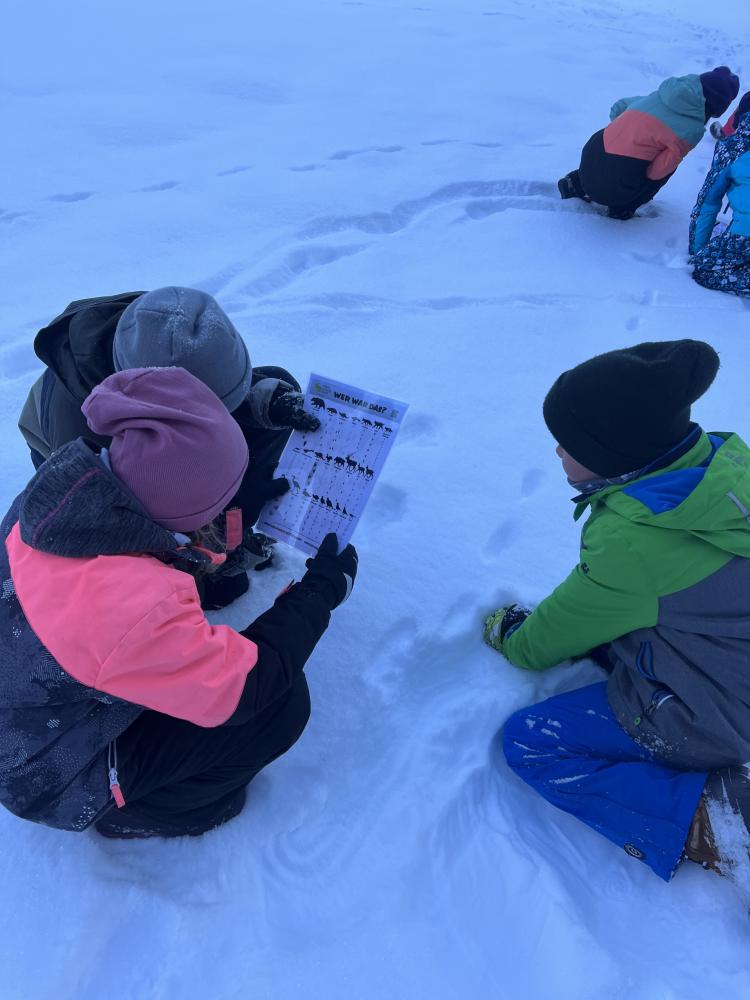 Der verschneite Wald wurde gemeinsam mit den WaldpädagogInnen Christoph und Astrid erkundet. Die SchülerInnen konnten viele Unterschiede zwischen dem Wald im Herbst und dem Winter feststellen. Besonders fasziniert waren die Kinder von der Spurensuche, bei der sie vielen unterschiedlichen Pfotenabdrücken quer durch den Wald folgten. Laut der 3. Klasse wurde sogar eine Bärenspur entdeckt ;-)
