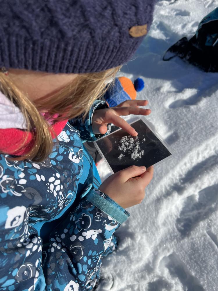 Dass uns nach der Essenspause wieder warm wurde, stand ein Staffellauf mit Puzzleteilen auf dem Programm. Das Ergebnis waren verschiedene Bilder von Schneekristallen. Astrid und Christoph erklärten uns, dass Schneekristalle je nach Temperatur unterschiedliche Formen einnehmen. Mit der Hilfe von Lupen konnten die SchülerInnen dann selbst den Schnee untersuchen und verschieden geformte Kristalle finden. Der Tag im verschneiten Wald war kalt und bezaubernd zugleich.