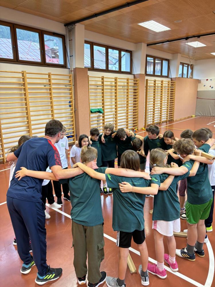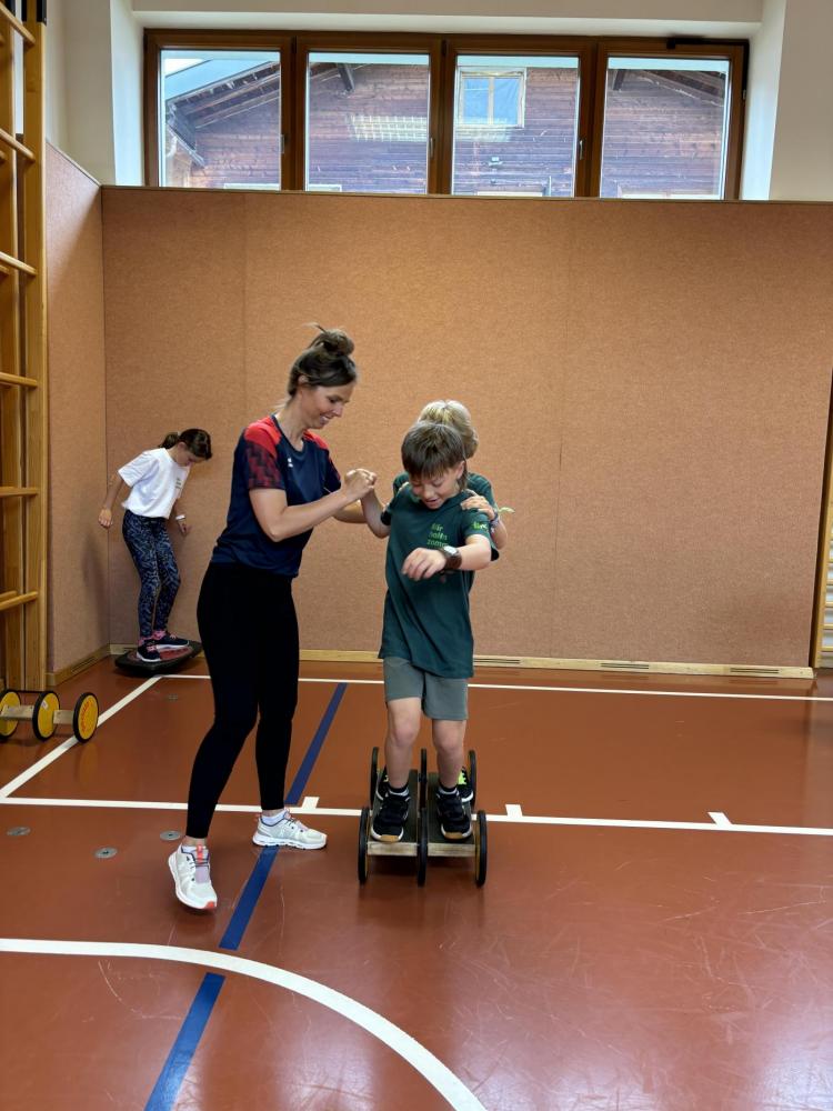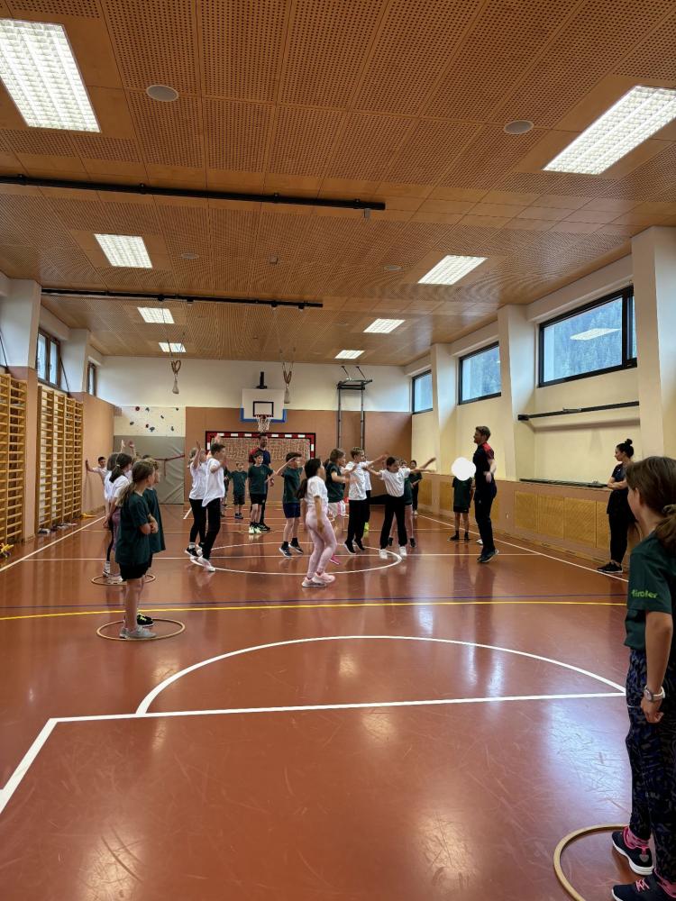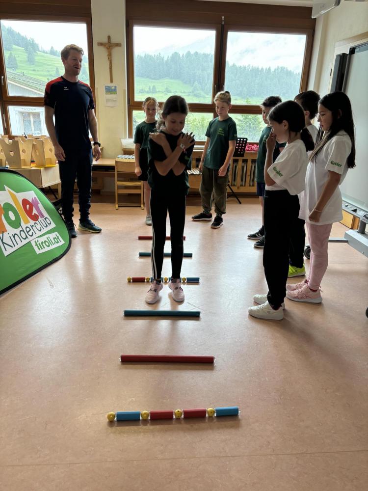 Nach einer herzlichen Begrüßung und der Übergabe von T-Shirts der Tiroler Versicherung ging es sportlich los: Die 4. Klasse startete im Turnsaal mit Wurf- und Balancierstationen, einem Staffellauf und dem Teamspiel „Pipeline“, bei dem ein Ball über eine selbstgebaute Strecke ins Ziel gebracht werden musste. Gleichzeitig war die 3. Klasse im anderen Raum aktiv – mit Balanceboards und passenden iPad-Spielen, Becherstapeln auf Zeit und koordinativem Springen.