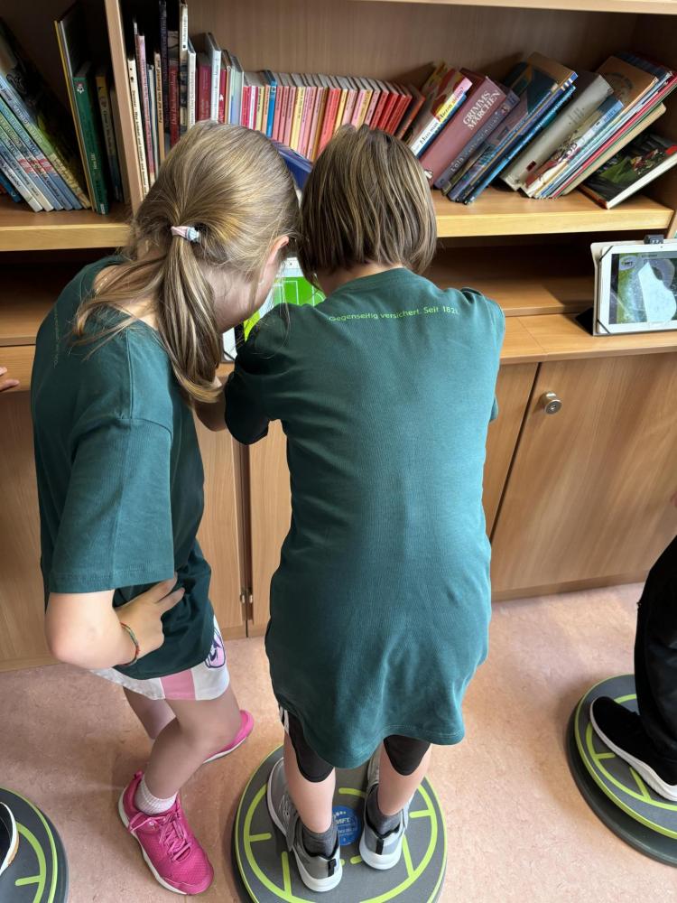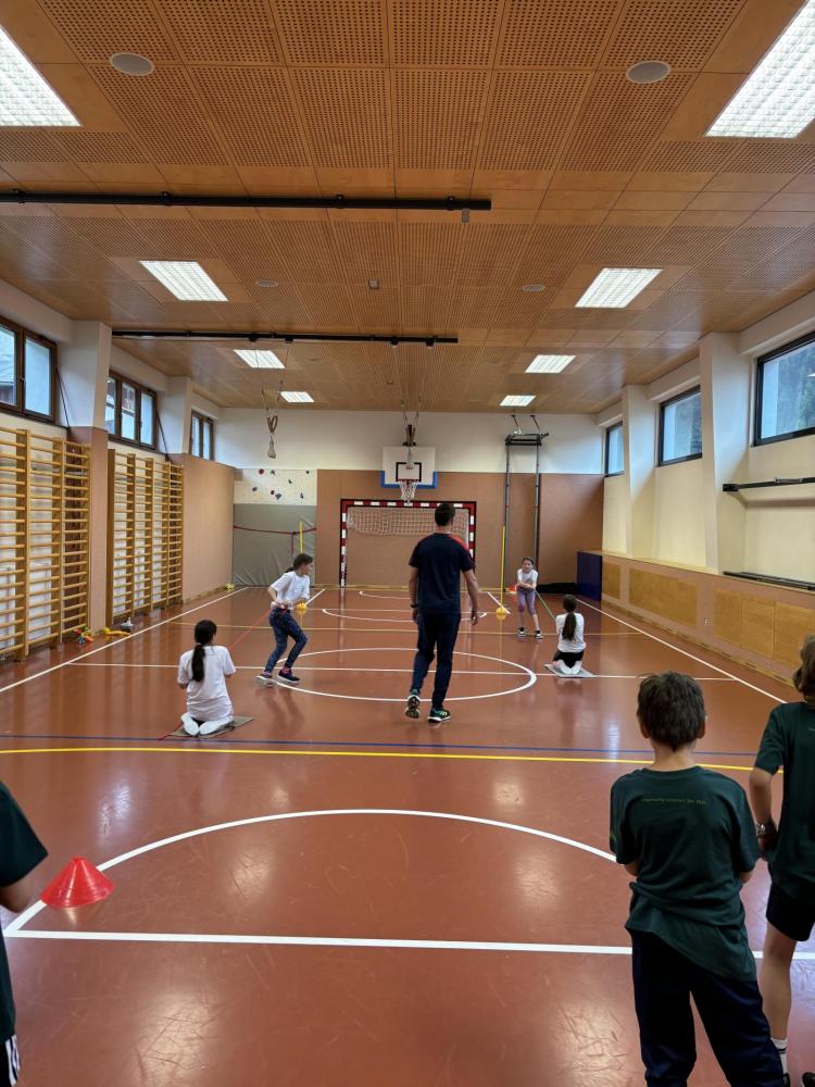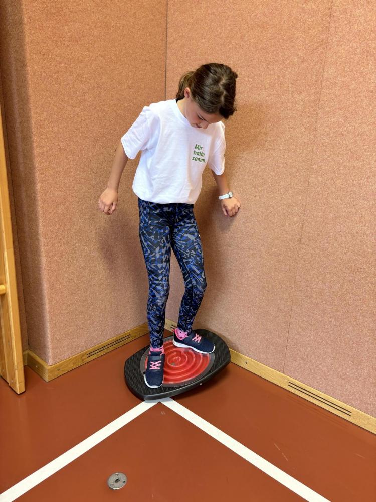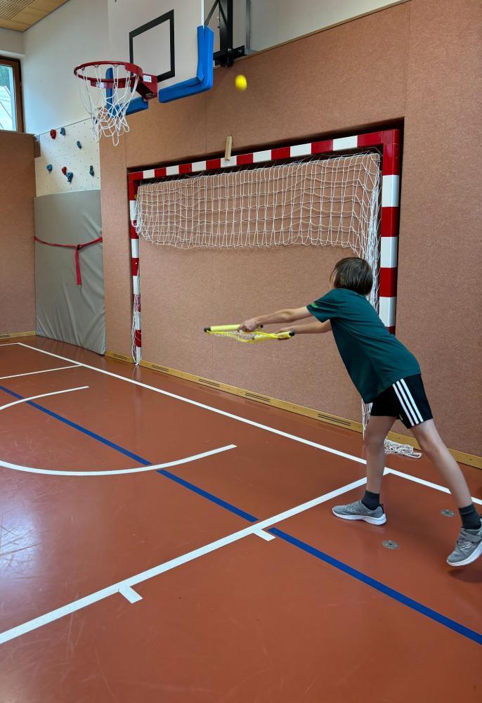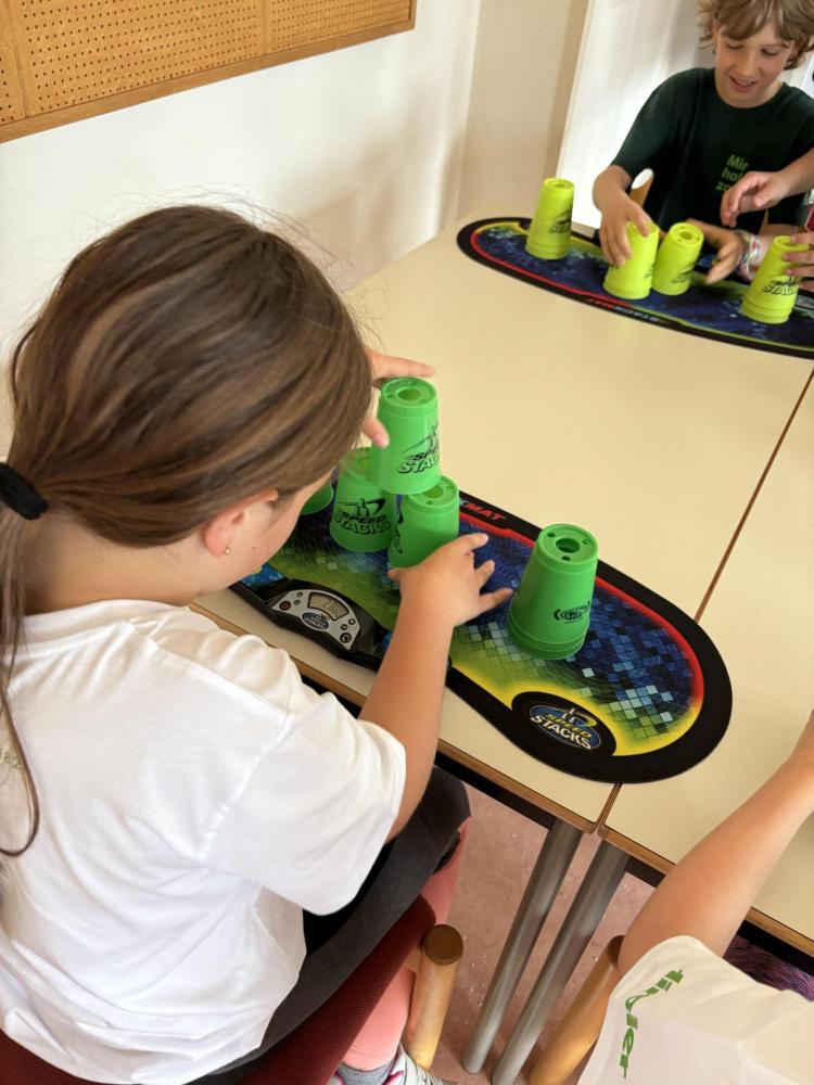 Nach einer herzlichen Begrüßung und der Übergabe von T-Shirts der Tiroler Versicherung ging es sportlich los: Die 4. Klasse startete im Turnsaal mit Wurf- und Balancierstationen, einem Staffellauf und dem Teamspiel „Pipeline“, bei dem ein Ball über eine selbstgebaute Strecke ins Ziel gebracht werden musste. Gleichzeitig war die 3. Klasse im anderen Raum aktiv – mit Balanceboards und passenden iPad-Spielen, Becherstapeln auf Zeit und koordinativem Springen.