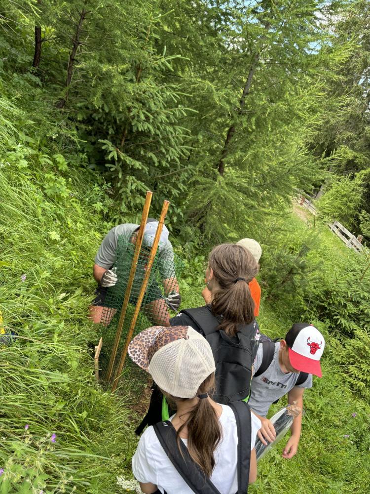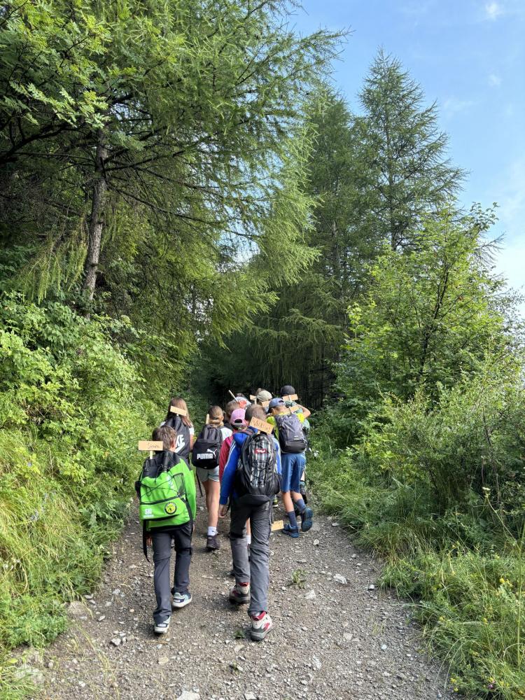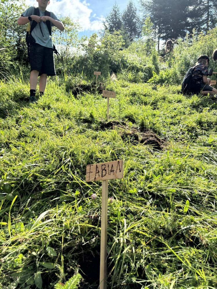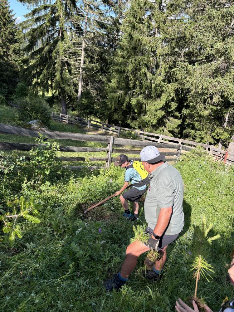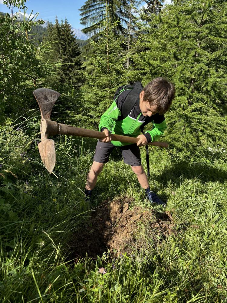 Zum Abschluss ihrer Volksschulzeit machte sich die 4. Klasse zu Fuß auf den Weg zum Mösle. Dort wartete bereits Waldaufseher Paul Waldegger, der den Kindern Spannendes über den Wald und die Baumarten erzählte. Anschließend durfte jedes Kind ein eigenes Bäumchen pflanzen – Lärche, Kiefer, Tanne oder Fichte. Mit viel Einsatz wurden Löcher gegraben, die Bäumchen eingesetzt, festgedrückt und mit einem Namensschild versehen. Zum Schutz bekamen die Tannen zwei Holzpfähle und ein Netz, die Lärchen zwei Holzpfähle, Fichten und Kiefern jeweils einen. Paul erzählte zum Abschluss noch über Wild, das junge Bäume frisst, und über den Borkenkäfer.