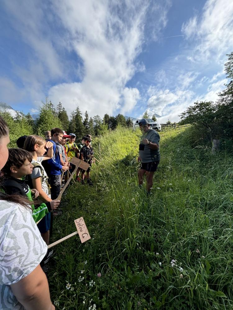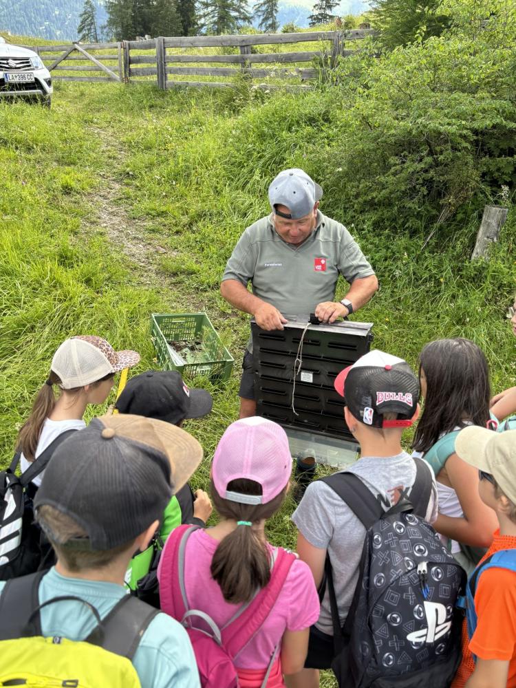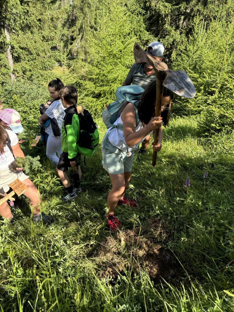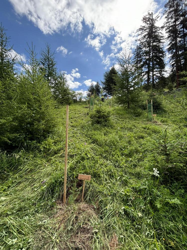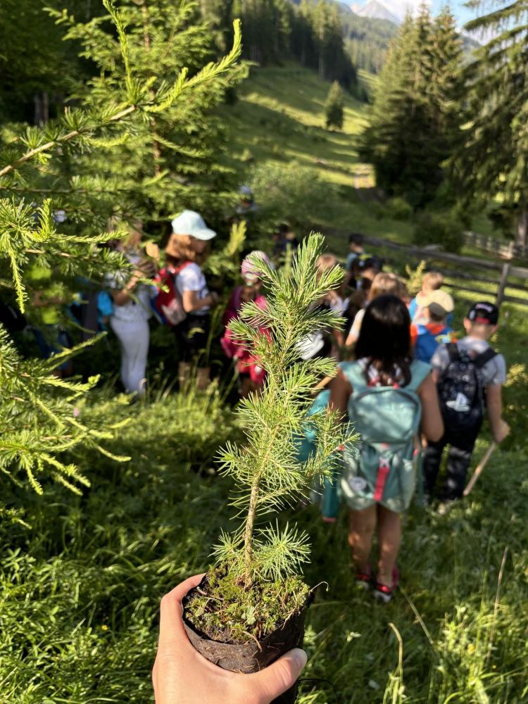 Zum Abschluss ihrer Volksschulzeit machte sich die 4. Klasse zu Fuß auf den Weg zum Mösle. Dort wartete bereits Waldaufseher Paul Waldegger, der den Kindern Spannendes über den Wald und die Baumarten erzählte. Anschließend durfte jedes Kind ein eigenes Bäumchen pflanzen – Lärche, Kiefer, Tanne oder Fichte. Mit viel Einsatz wurden Löcher gegraben, die Bäumchen eingesetzt, festgedrückt und mit einem Namensschild versehen. Zum Schutz bekamen die Tannen zwei Holzpfähle und ein Netz, die Lärchen zwei Holzpfähle, Fichten und Kiefern jeweils einen. Paul erzählte zum Abschluss noch über Wild, das junge Bäume frisst, und über den Borkenkäfer.